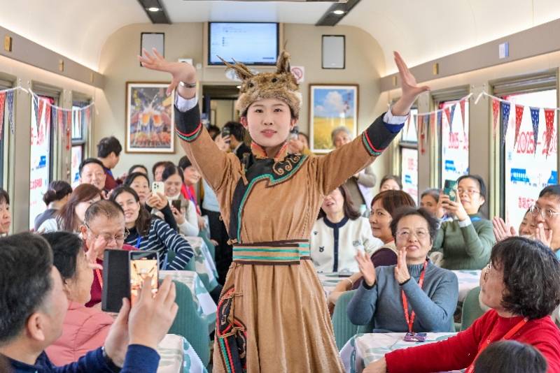 2025年12月28日,游客在旅游列车上观看鄂伦春族民俗表演。该趟旅游专列将持续开行至2026年2月。 新华社发(原勇 摄)