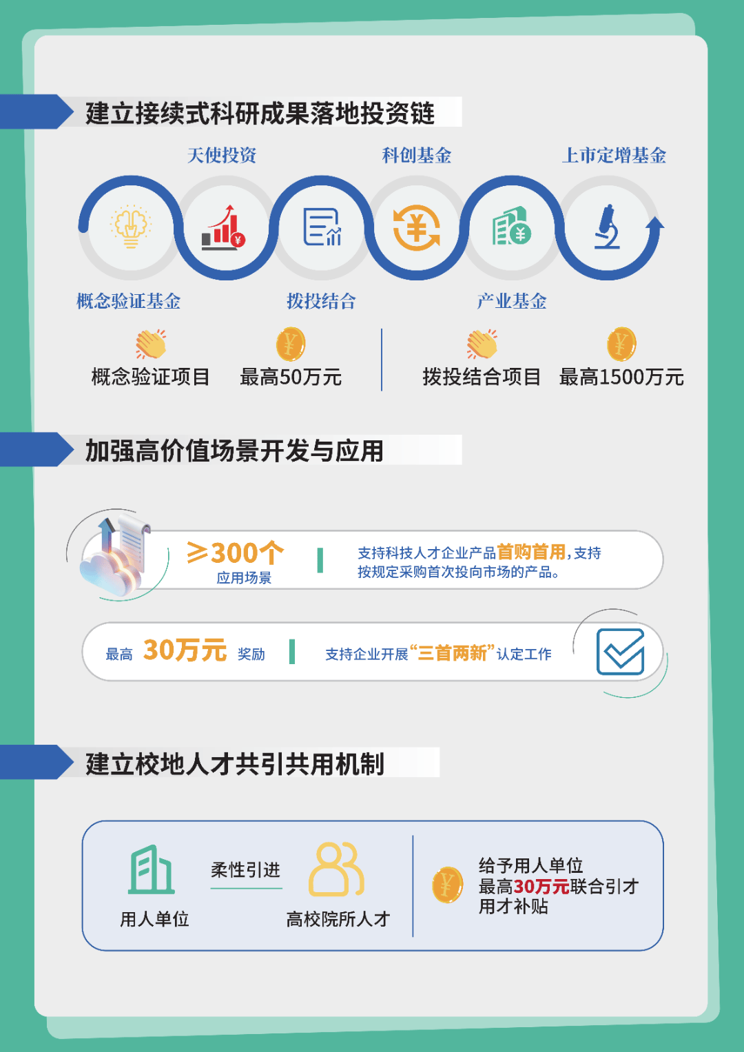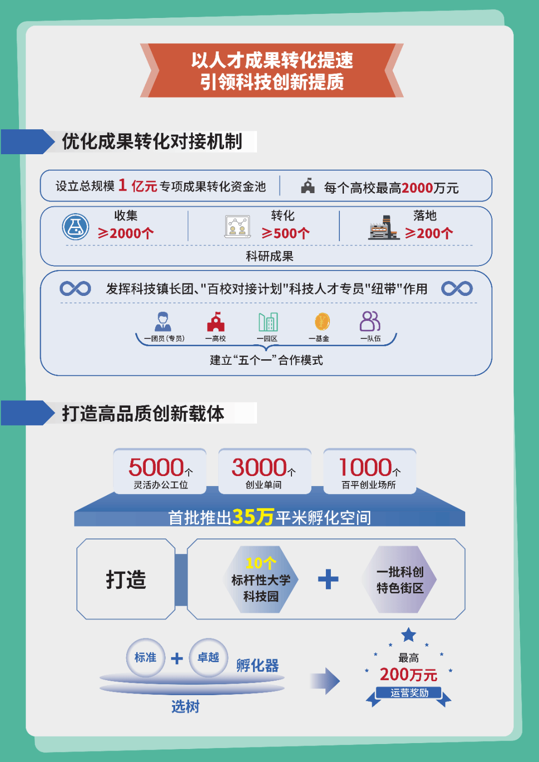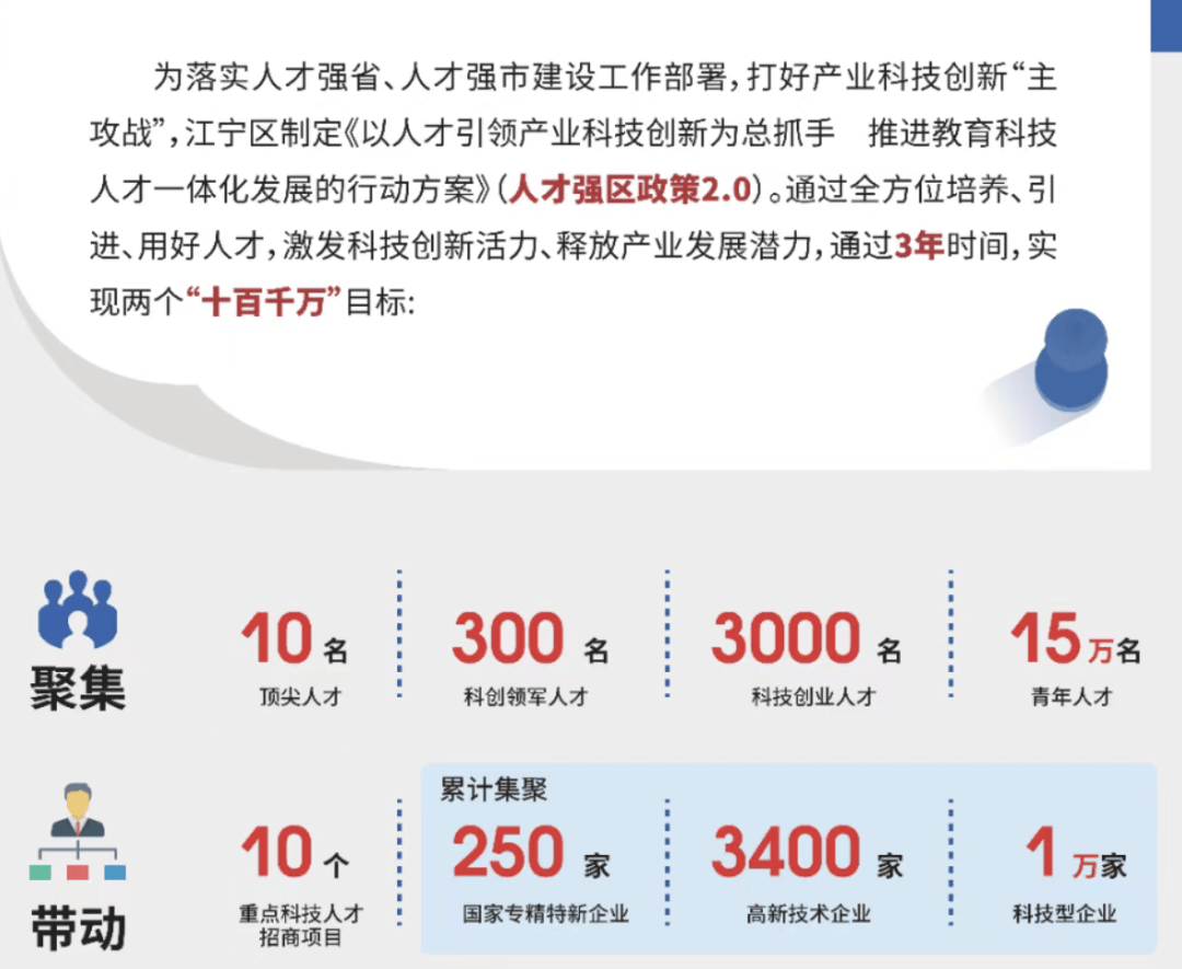 第一个,聚集10名顶尖人才、300名科创领军人才、3000名科技创业人才、15万名青年人才;