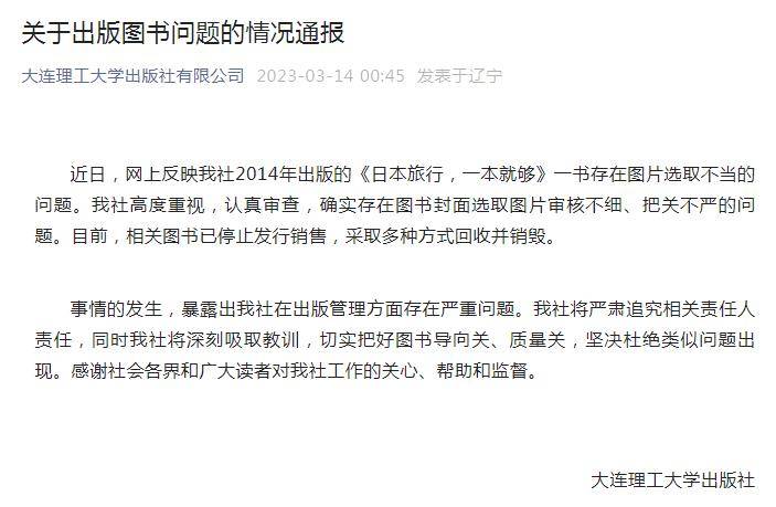 3月14日凌晨,大连理工大学出版社发布通报,承认图书封面审核不细、把关不严的问题。称停止发售该书,采取多种方式回收销毁,追究相关责任人。